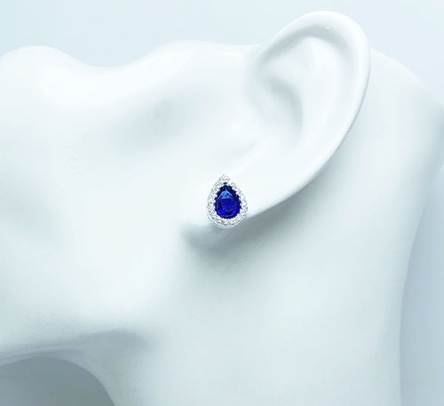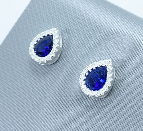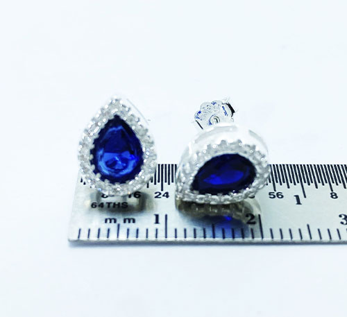 Aretes de plata ley 0,950 con zafiro creado, talla lágrima de tamaño 8×6 mm. El zafiro creado en laboratorio tiene la misma composición química y un alto parecido en su aspecto y brillo al zafiro natural. Acompañado de 18 chispas de circón de 0,5 mm.
