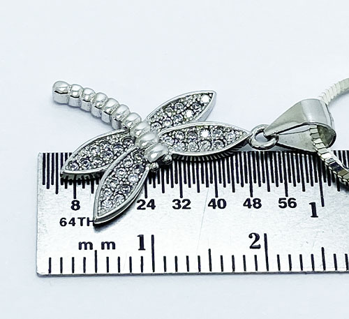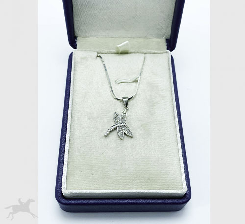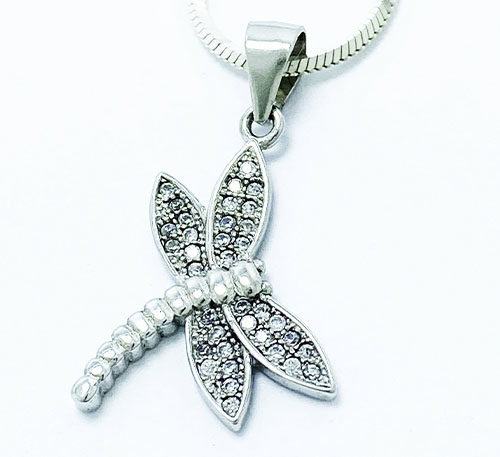 Dije de plata ley 0,925 con circones naturales talla redonda de tamaño 1 mm de diámetro. Diseño libelula