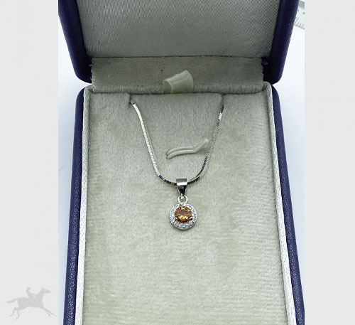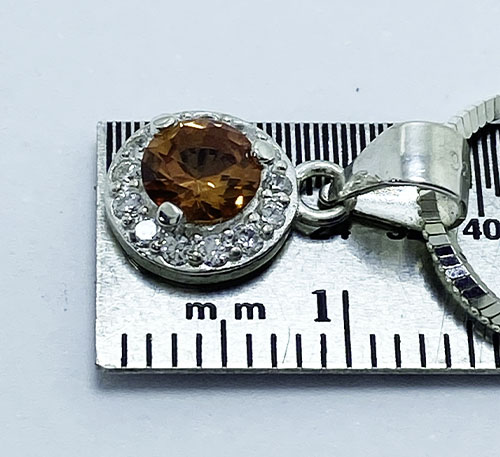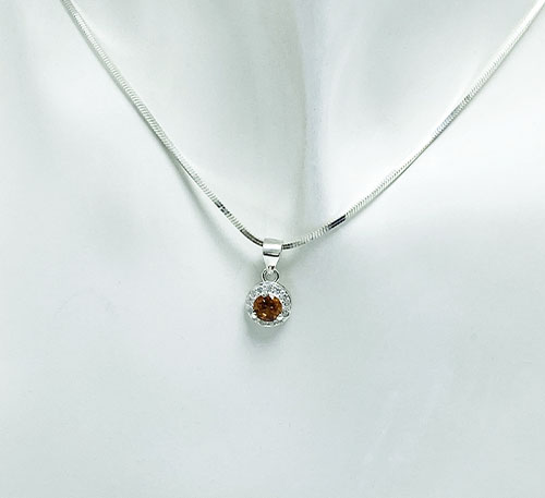 Dije de plata ley 0,925 con citrino natural , talla redonda de diámetro 6 mm y 1 quilate de peso. Diseño de uñas con circones de 1,0 mm de diámetro