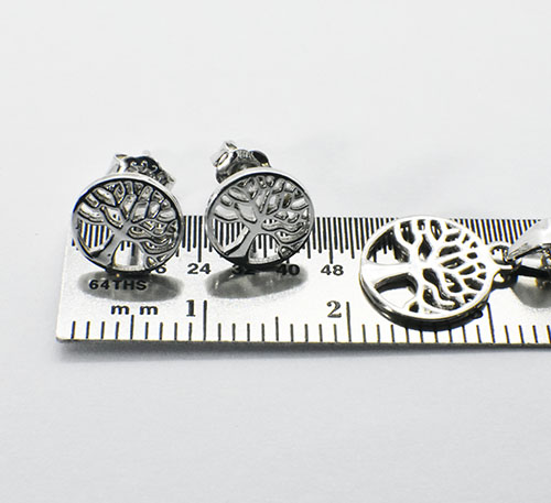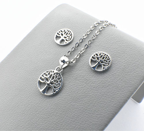 Set dije collar y aretes de plata ley 0,925, peso 4,5 gramos. Diseño de arboles Baobat.