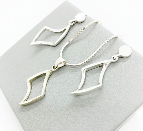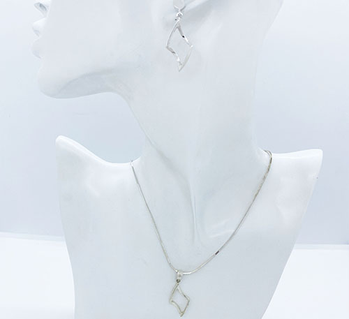 Set dije collar y aretes de plata ley 0,925, peso 11,5 gramos. Diseño de hojas con movimiento.