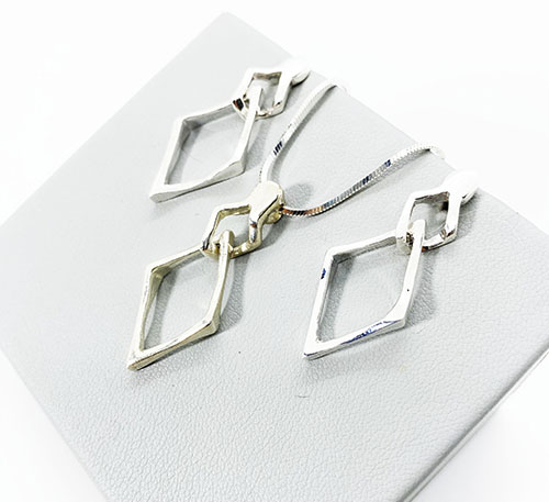 Set dije collar y aretes de plata ley 0,925, peso 12,5 gramos. Diseño de romboidales con movimiento.